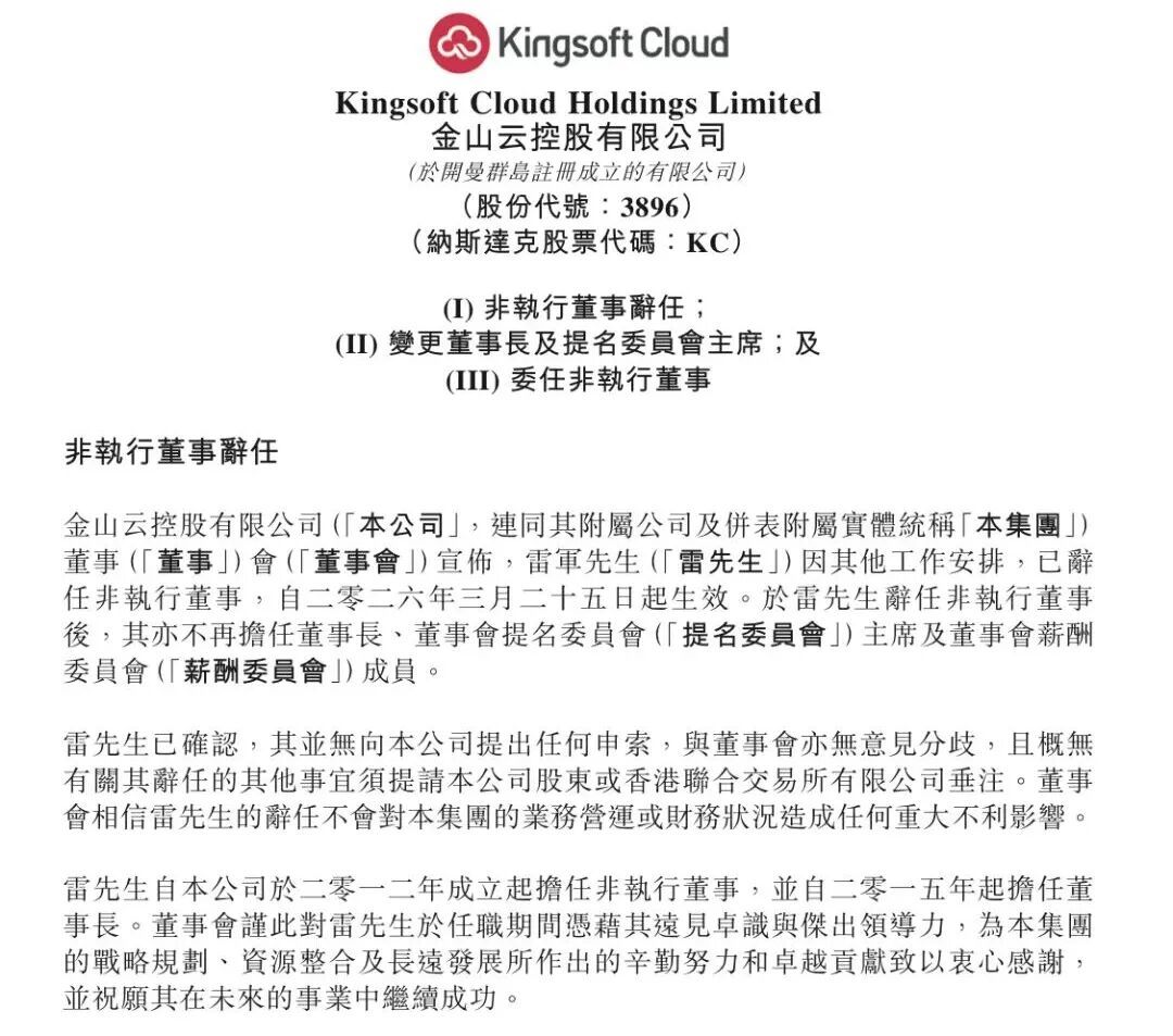 3月25日,金山云发布公告,正式宣布雷军辞任公司非执行董事,自当日起生效。雷军同步卸任董事长、董事会提名委员会主席及董事会薪酬委员会成员等全部相关职务,结束了其在金山云长达11年的掌舵生涯。